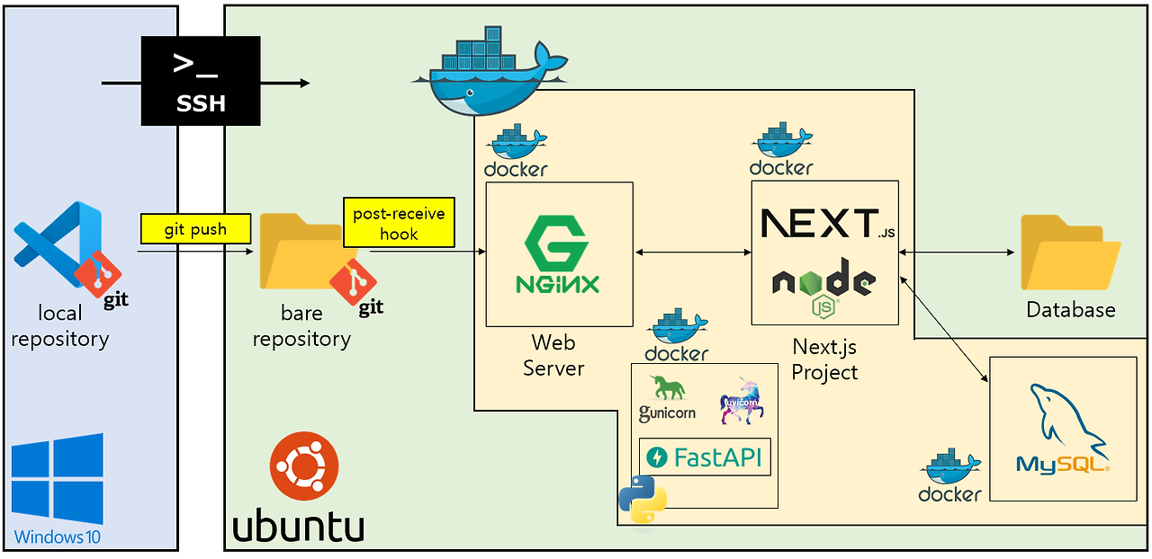 저번 글에서 정리한 이론을 토대로 실제 git 서버를 구축해보고자 한다.2025.02.04 - [DevOps/Git] - 폐쇄망에서 배포용 Git 서버 구축하기 --- (1) 이론이 git 서버로 Next.js, FastAPI 서버 등 여러 개를 배포해봤는데 이 글에서는 Next.js를 예시로 정리할 것이다.1. 배포 서버에 Bare Repository 구축 git init --bare 명령어를 통해 Bare Repository를 만든다. 2. 만든 Bare Repo 내부의 hooks 디렉토리에 들어간 후, "post-receive" 훅 스크립트 작성nano 등의 명령어로 post-receive 스크립트를 작성하면 된다. 본인의 상황에 맞게 배포 방식에 대해 적으면 되는데,대충 git clone이나 gi..